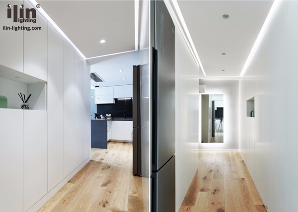 進門的門廳空間,直對其實是一個衛生間,為了避免進門直對衛生間,定制過道收納柜以及鞋柜的時候,衛生間做了隱形門,視覺上更完整。鞋柜對面和西廚連接的是整體衣柜,同樣做了隱形門無把手設計,視覺上更干凈。進門左手的全身鏡燈光設計全當進門照明。平面吊頂,兩邊LED燈帶局部照明,能看開放式廚房的全景,白色與灰色清新搭配。