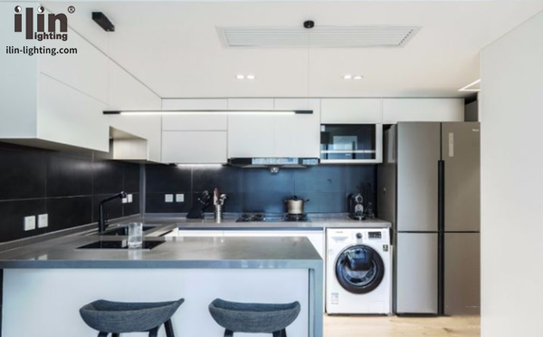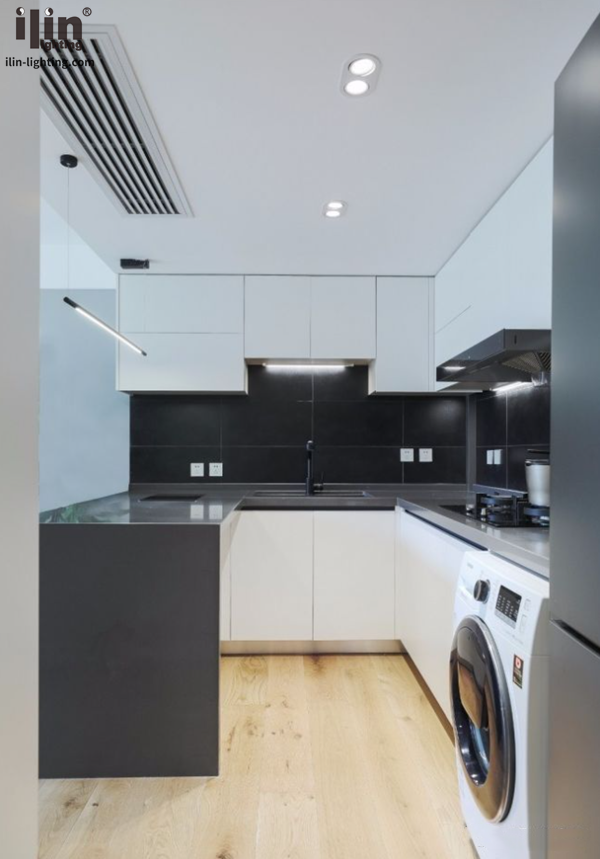 開放式廚房白色與灰色清新搭配,延伸出吧臺可以兼做書桌使用,吊柜底部都安裝了線型櫥柜燈,這樣可以照亮深色的操作臺。