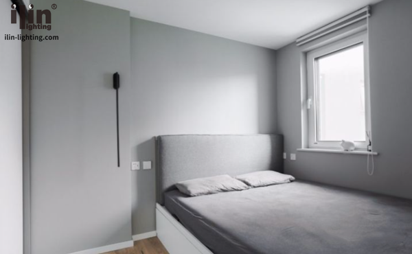 臥室設計灰墻白頂,極簡層次,左手通頂移門衣柜收納,床頭極簡黑色壁燈輔助照明。床頭角落放置,灰色素雅,非常極簡。