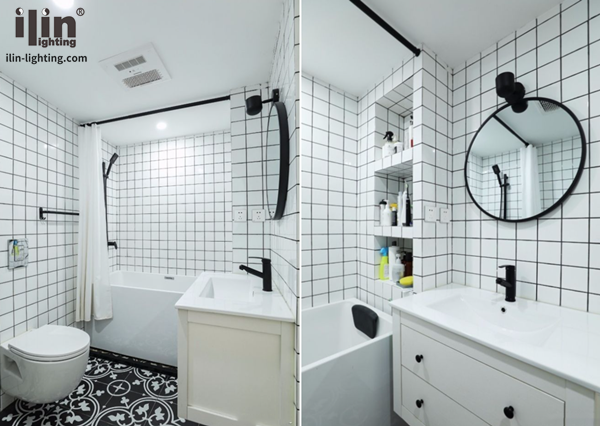 入戶門直對的衛生間,衛生間不大,經典的小白磚清新鋪貼,地面黑白大花瓷磚,整體非常簡潔清爽。浴缸后面利用包管道位置做了壁龕收納,成品的白色浴柜,精致圓鏡搭配,黑色五金非常有質感。門口凹陷區剛好做了收納柜處理,可以收納各種清潔用品。