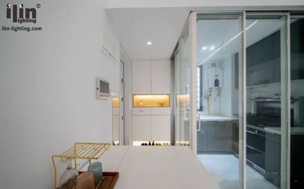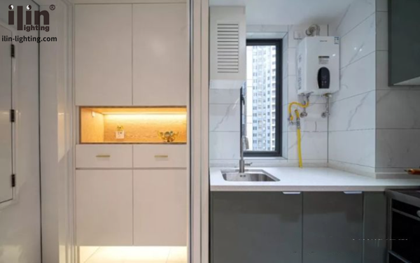 利用進門左手打造頂天立地的鞋柜,鏤空的地方安裝感應櫥柜燈,滿足一個人的隨手收納,直對就是狹小的廚房,砸掉墻體以后,空間以及光線豁然開朗。
