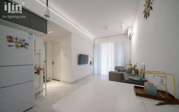 廚房門口放了冰箱,簡單置物架作為展示,上方吊柜收納。移動主臥墻體以后剛好和冰箱平齊,上方吊頂處理,線型LED燈帶布局,滿足照明,同時視覺拉伸空間,整體大白墻素雅極簡,去掉茶幾以及電視柜,讓整體空間通暢開闊。