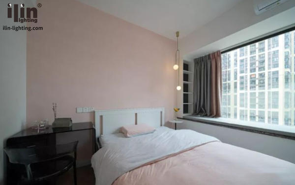 主臥空間很小,背景和床品粉色搭配,體現女性的柔和,書桌兼顧化妝臺代替床頭柜功能,利用飄窗一角打造隨手的書架,吊線燈滿足氛圍的營造。靠近窗戶大理石圓幾代替床頭柜,極簡質感,綠植點綴,干凈清爽。