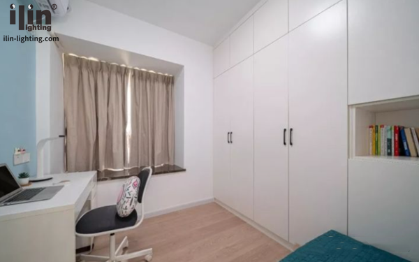 次臥空間打造滿墻的衣柜滿足衣帽間以及書籍的放置,對面書桌布局,滿足平時在家辦公的功能,大面積白色,書桌背景采用藍色變色,清新簡單。