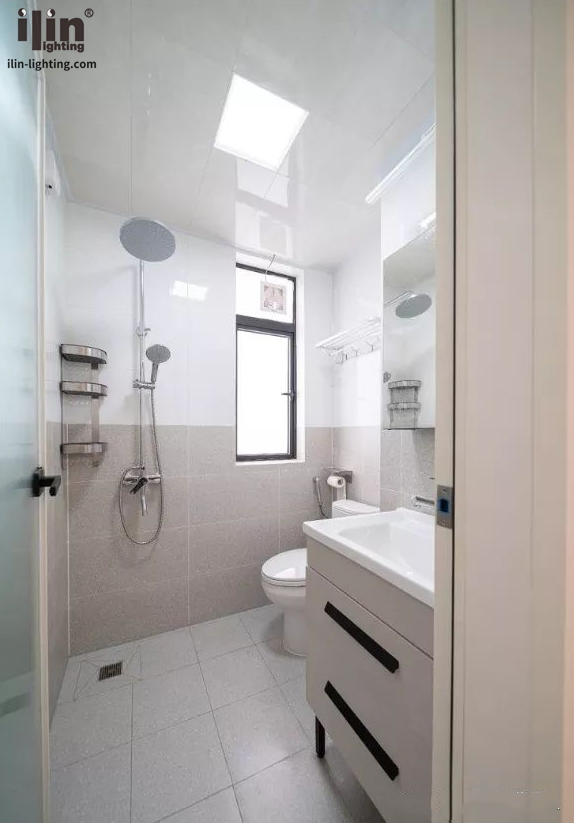 衛生間統一淺色瓷磚上下墻布局,滿足一個人的基本功能。