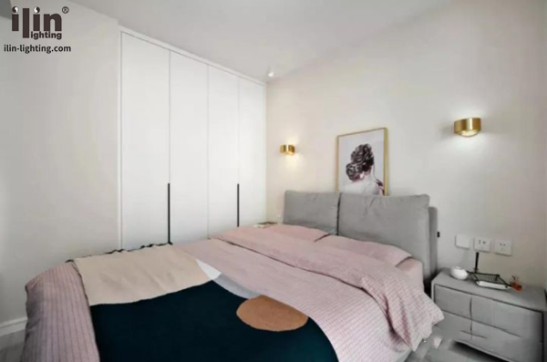 臥室的玻璃隔斷分割讓空間不擁擠,光線更通透,利用陽臺一邊打造收納柜滿足平時雜物的收納,玻璃全景移門布局,視覺和光線都能發揮到極致。灰色的布藝床鋪以及床頭柜,素雅干凈,粉色的床品空間變得柔和,背景是與風格統一的金色壁燈點綴,局部墻體的新砌實現了衣柜的鑲嵌以及外面冰箱的布局。