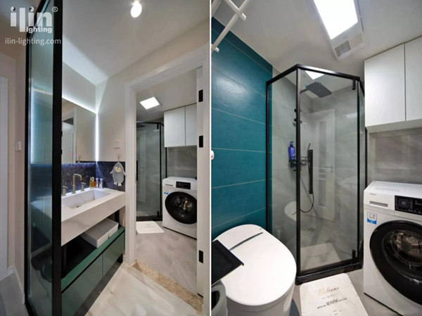 入門左手的衛生間,為了盡可能利用空間,砸掉墻體采用玻璃隔斷,盡可能放大干區位置,滿足干區浴柜的最大化。濕區采用灰色素雅瓷磚,馬桶背景藍色皮質瓷磚提升視覺層次,黑色淋浴房分割以后,剛好滿足外面的洗烘機布局。