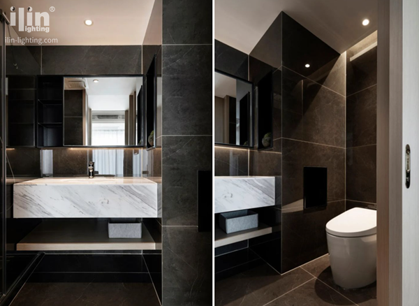 干區(qū)洗手臺(tái)選擇墻排,底部沒(méi)有水管,更精簡(jiǎn)也方便清潔。大理石臺(tái)面高度剛好覆蓋水管銜接位置,側(cè)面壁龕提前預(yù)留了電路,方便后期充電,細(xì)節(jié)滿分!吊頂邊緣留空,嵌入燈帶和小角度射燈,照亮馬桶,高級(jí)感十足。