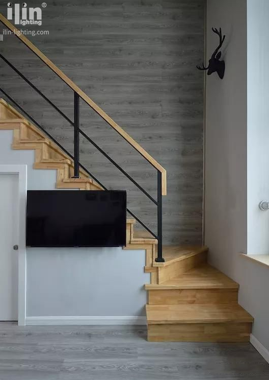 樓梯側(cè)墻采用木地板上墻的形式,讓空間更有層次,與地面呼應(yīng)一體。