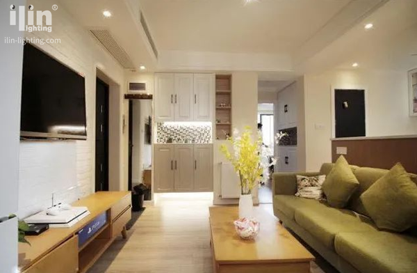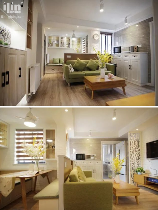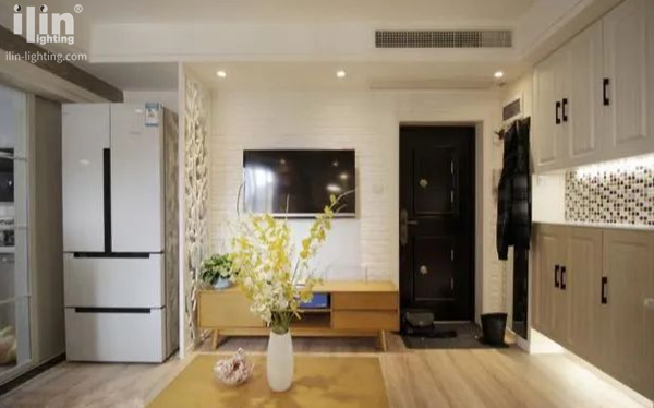 入戶門右手邊是電視背景墻,采用白色文化磚粘貼,與實木電視柜搭配,簡約時尚,文化氣息濃厚。高大冰箱的旁邊用白色鏤空隔斷分隔,不但裝修效果明顯,還不影響冰箱的散熱,小小的空間大方得體,每1㎡都做到物盡其用!