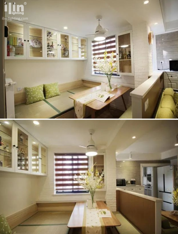 餐廳為雙卡座形式設計,采用日式榻榻米的布局,非常簡潔利落,卡座上方墻面通長設計的玻璃門儲物柜,明亮通透,除了收納功能外,還具有展示效果,搭配光線柔和的吊扇燈、柜內的櫥柜燈等,為餐廳營造出優雅溫馨舒適的就餐環境。原木色餐桌與卡座靠背板的原木風,給人以溫暖的感覺,清新自然和諧。
