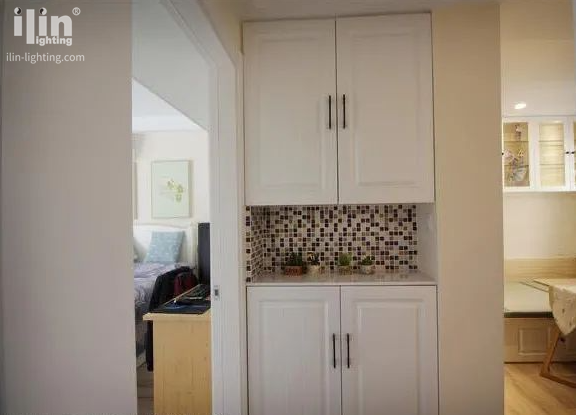 視角正對的是入戶門玄關鞋柜。通體的白色柜體采用上下柜結構,中間鏤空處背景板鋪貼了黑白相間的馬賽克瓷磚,低調經典,搭配櫥柜燈帶照明,方便進門時放置包包、鑰匙等隨手攜帶物品。鞋柜底部留空,用于擺放常用的鞋子。進門左手邊墻面裝了一面穿衣鏡,外出換衣時一定要讓自己美美噠。