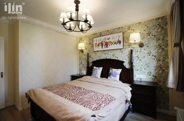 主臥房間的床頭背景墻采用美式田園風格的壁紙鋪裝,為整體家居增添新意,營造安靜健康舒適的睡眠空間。