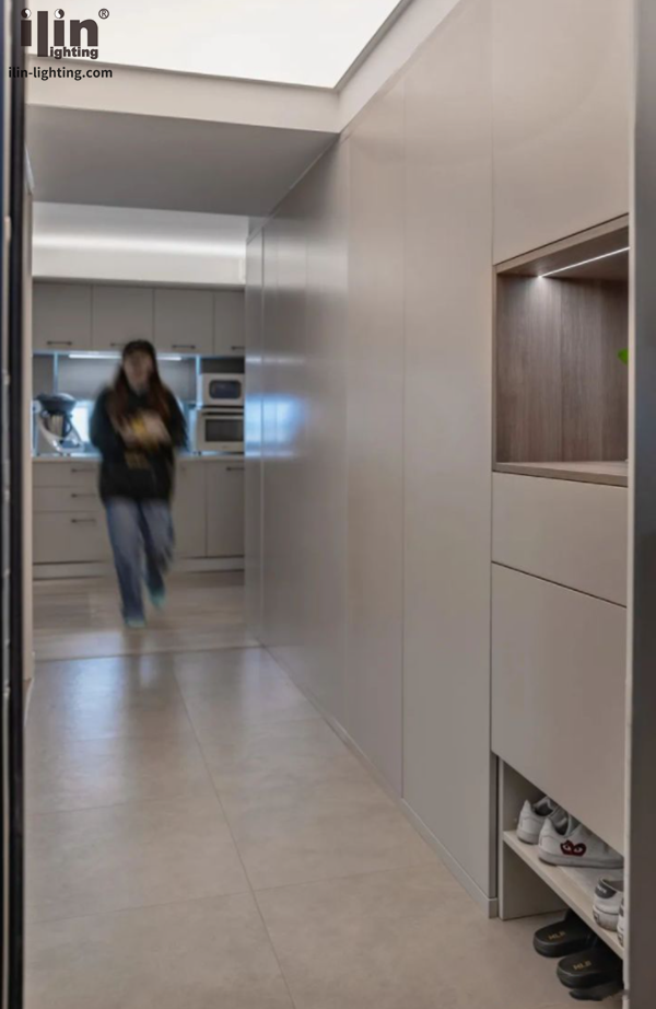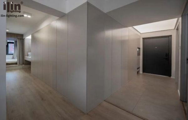 玄關(guān)作為連接室內(nèi)和室外的第一個功能空間,是家的第一印象,是屋主由外而內(nèi)或者由內(nèi)而外轉(zhuǎn)換心情和狀態(tài)的第一站。為了高效利用空間,設(shè)計師在原來的入戶空間增加了兩個老人房,形成現(xiàn)在的玄關(guān)走廊,并沿走廊設(shè)計一排收納衣柜,滿足全家的收納需求。玄關(guān)設(shè)置了隱藏式收納柜,整體取色為淺灰色,方便清潔。靠近門口的收納柜設(shè)置兩處開放格,靠下方的用來放置外出用鞋,中間凹槽位置安裝了嵌入式櫥柜燈照明。
