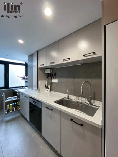 水吧安排在室內(nèi)比較中點的位置,由于原戶型層高不高,在水吧區(qū)的定制柜并未到頂,留出櫥柜燈的位置,提高采光效果,延長視覺感受。即使是光線不好的凌晨或晚上,也能夠看清每個角落。