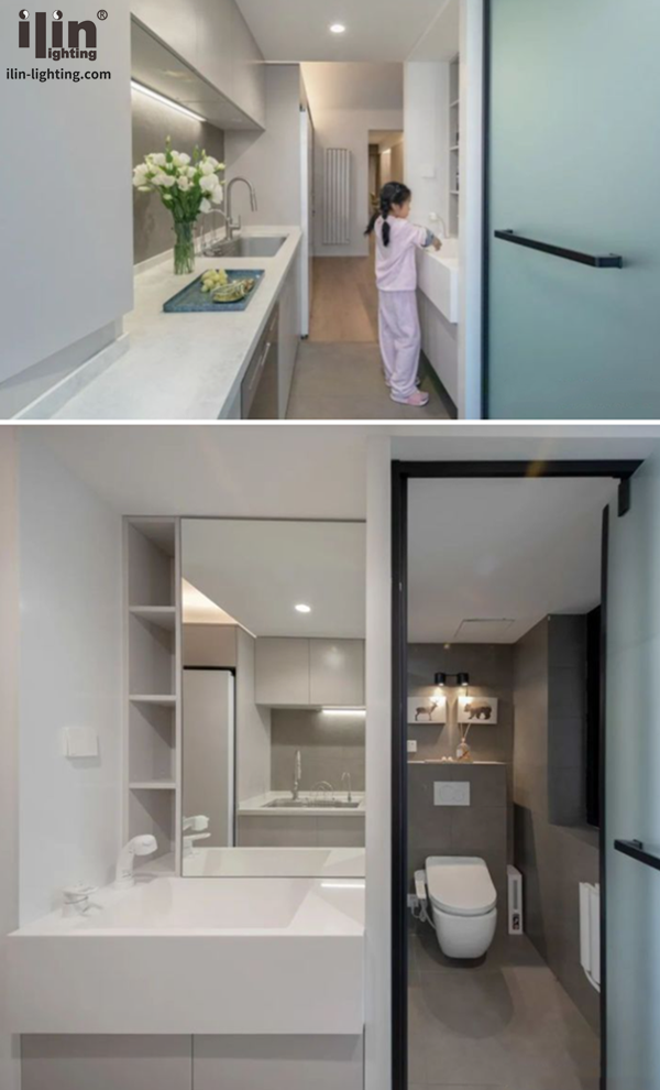 這個過道中,靠左的一側(cè)是廚房、水槽、水吧等功能分區(qū),靠右的一側(cè)是餐桌、洗手臺、生活陽臺等功能分區(qū)。一室多用,一個過道,左右兩側(cè)承擔(dān)了不一樣的動線功能,能夠瞬間提高空間利用效率,方便家人使用。在設(shè)計洗手臺時,龍頭側(cè)裝可以縱向節(jié)省空間,龍頭靠近餐桌的一側(cè),方便就餐洗手。
