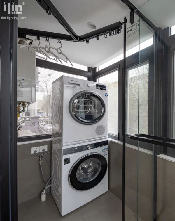 生活陽臺設(shè)置在與灶臺相對的陽臺的另一側(cè),保證了良好的采光效果,折疊衣架可以滿足全家人的晾衣需求。生活陽臺與灶臺用玻璃門進(jìn)行隔斷,避免油煙進(jìn)入到生活陽臺區(qū)。