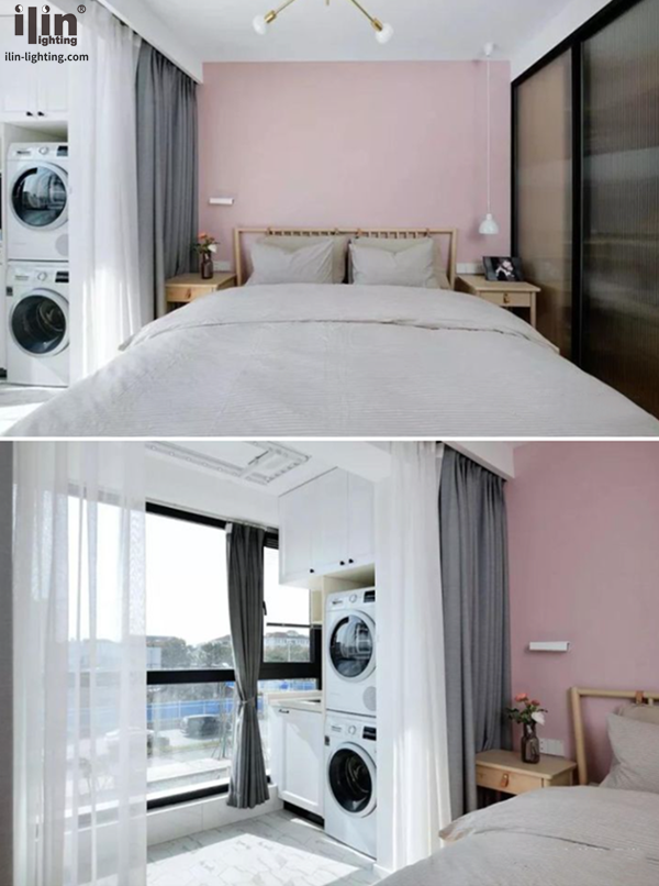 主臥采用粉色背景提亮視覺空間,原木簡潔的家具可以讓空間放大,右手以長虹玻璃移門的衣帽間。為了隨時放大空間,生活陽臺與臥室采用窗簾做隔斷,布局洗烘機以及洗衣池,主要滿足晾衣生活功能。