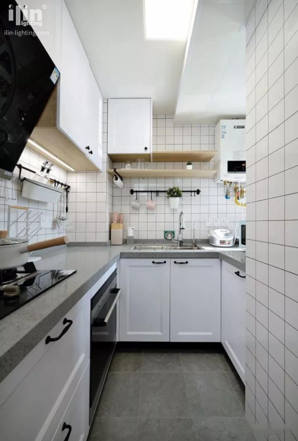 廚房大面積白色為主色調,讓視覺上更清新,經典小白磚搭配地面防滑水泥磚,白色櫥柜定制視覺更明亮,隔板代替吊柜,滿足收納同時視覺更靈活。空間不大,滿足洗切炒功能,吊柜下方安裝了手掃櫥柜燈滿足晚上的基本操作。