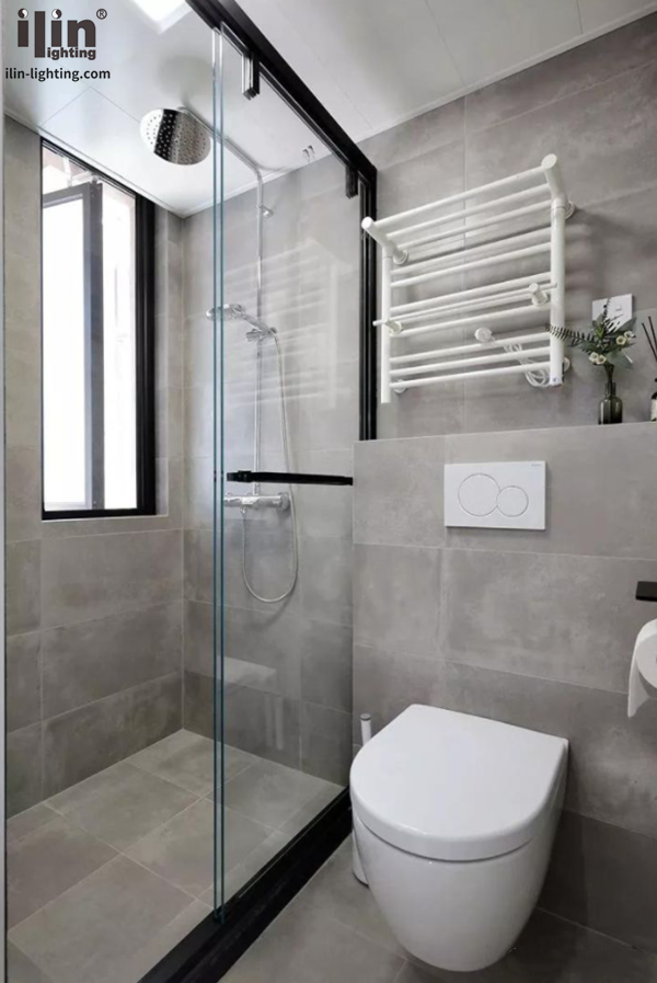 衛生間縮小以后濕區做了墻排馬桶,更利于打掃衛生,淋浴隔斷分區布局,馬桶上方剛好布局電熱毛巾架滿足功能,統一水泥瓷磚素雅干凈。