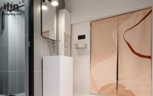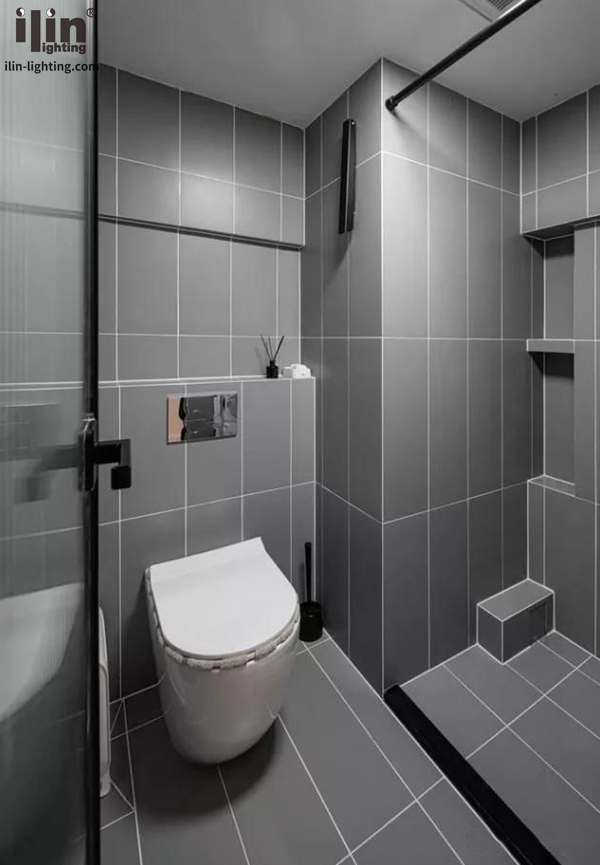 樓上衛(wèi)生間很小,與樓下廚房采用同樣款式的瓷磚,壁掛馬桶不留衛(wèi)生間死角,同時上方臺面還能置物,淋浴地方采光擋水加浴簾的形式分割,壁龕滿足收納。