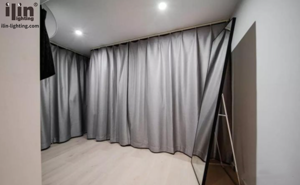 衣帽間內部,其實這個就是過道上方的贈送空間,剛好做成衣帽間,全部采用簾子遮擋,放上全身鏡,非常完美。