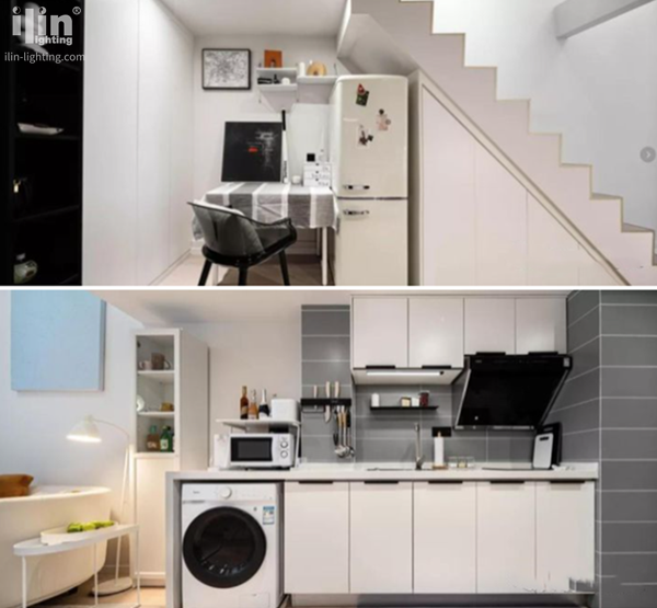 進門左手定制頂天立地收納柜,兼顧收納同時兼顧進門的鞋柜,樓梯下方打造一部分收納柜,利用高度差剛好布局冰箱,剩余空間安置了一張小的餐桌,用來滿足一個人的就餐。進門右手過道就是開放式廚房空間,因為沒有天然氣,所以電磁爐完全滿足偶爾的烹飪需求,墻面采用水泥瓷磚鋪貼,搭配白色的櫥柜定制,柜底裝了一個櫥柜燈條照亮水槽。利用水槽下水位置剛好滿足洗烘機的鑲嵌,臺面上方置物架,放置小的家電。