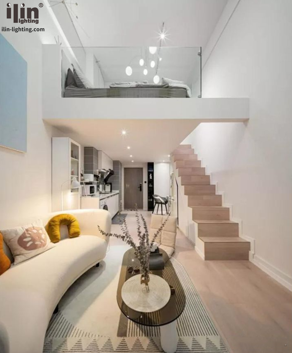 單身公寓有兩種,一種是平層公寓,一種就是挑空公寓,可以自己分割成兩層空間,滿足更多功能。今天這套挑空公寓層高本身4.7米,所以有隔層的需求,而做了隔層之后就要做好局部照明來保證采光。