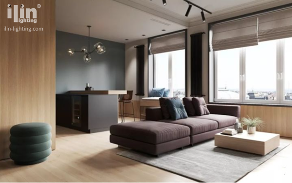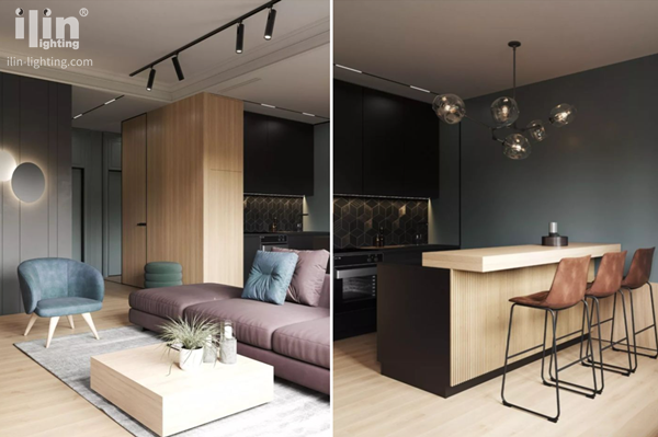 整個廚房兼顧了實用與美觀的原則,采用深色系作為空間基調,又適當加入溫潤的木材進行中和,輔以別致的分子燈、幾何磚、高腳椅,再加上櫥柜燈,給人一種時尚而精致的感覺。廚房島臺兼作餐桌使用,在輔助烹飪之余,也令空間變得彈性十足。