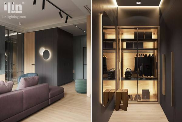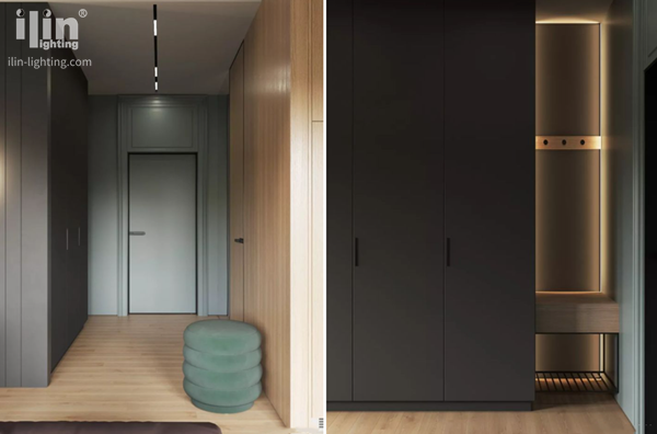 玄關的右側壁柜,同時還與這個家的衣帽間相連,在收納功能上進行巧妙重疊,實現了一個布局共通的設計。隱藏于玄關柜中有一個衣帽間,衣柜燈的使用很亮眼。