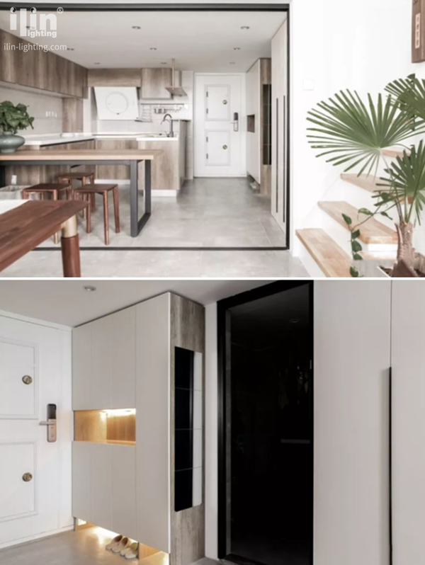 玄關(guān)是進門處最重要的位置,一個綜合性的收納空間非常適合小戶型,既可以擺放常穿的鞋子,也能收納一些雜七雜八的物件,鏤空部分安裝櫥柜燈做照明。鞋柜和玄關(guān)柜直接做成了通頂,第一是省去了招灰的麻煩,二是空間都被充分利用。玄關(guān)柜側(cè)面是衛(wèi)生間,全身鏡的布置完美地兼顧了沐浴后和出門前的使用需求。衛(wèi)生間門與樓梯之間設(shè)置了直線條的儲物柜,流暢的線條更能體現(xiàn)出高級。