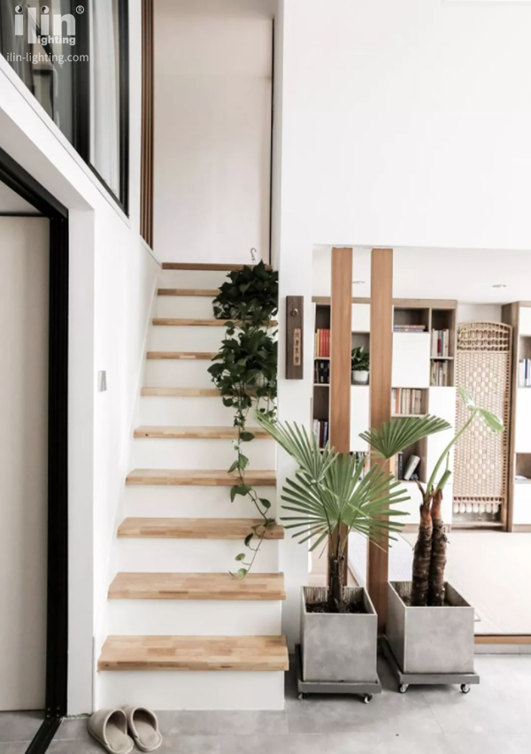 樓梯踏板采用2.5cm厚的白橡木指接板,觸感非常好,赤足踩上去之后,會有暖暖的安全感自腳底涌上來。小朋友在樓梯上跑上跑下,也不會擔心著涼。