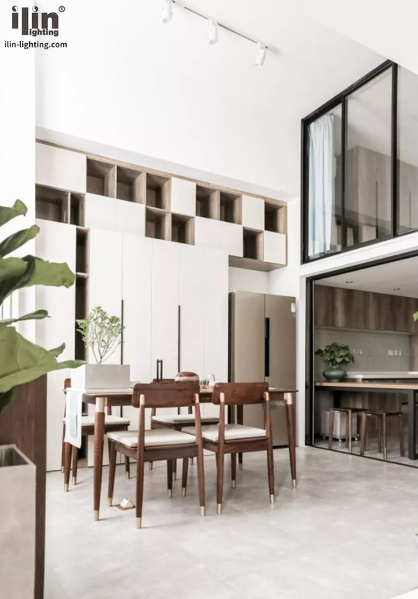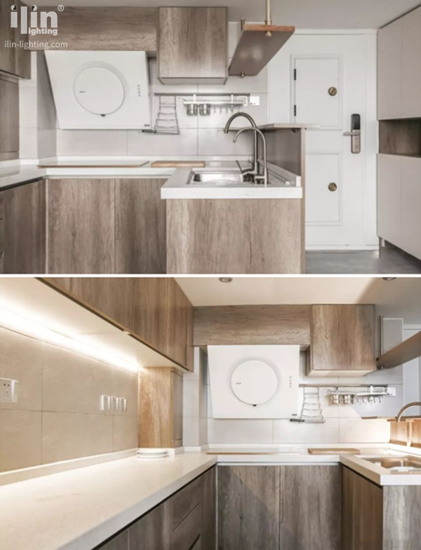 設(shè)計師把原來的開放式廚房改造成了半開放式,平時廚房的門會隱藏在墻壁內(nèi),做飯時就將滑門拉上,整個廚房會變成一個封閉的空間。廚房緊鄰玄關(guān)處,被設(shè)計成了敞開式以增強通透感。特意挑選了進口的原木制櫥柜門板,花色紋理非常耐看,吊柜底部也裝了和柜子一樣長的櫥柜燈來照明。U型廚房的一側(cè)留作西廚,預(yù)留了足夠長的操作臺和插座,可以在陽光下享受愉悅的烹飪時光。