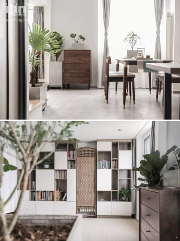 以往傳統(tǒng)家庭里客廳的標配都是沙發(fā)+電視,然而這一對屋主卻不希望這樣,整個客廳設(shè)計告別了電視背景墻主導(dǎo)的思路。因為屋主人很熱愛生活,比起下班后窩在家里看電視,玩手機打發(fā)時間,兩人更喜歡安靜地喝茶看書,所以他們的客廳更像是一個茶室,以書柜代替電視柜,以一套胡桃木桌椅代替沙發(fā)和茶幾,兼具了辦公和休閑兩種功能。