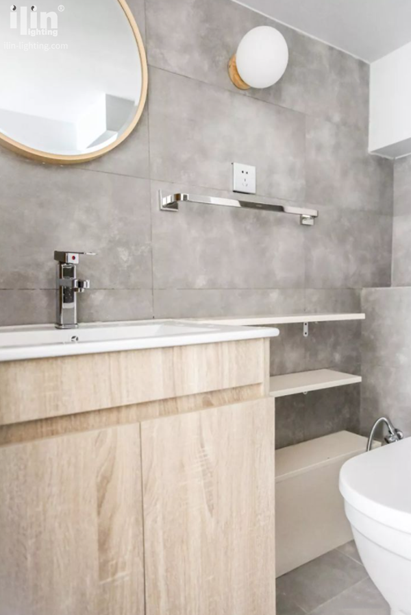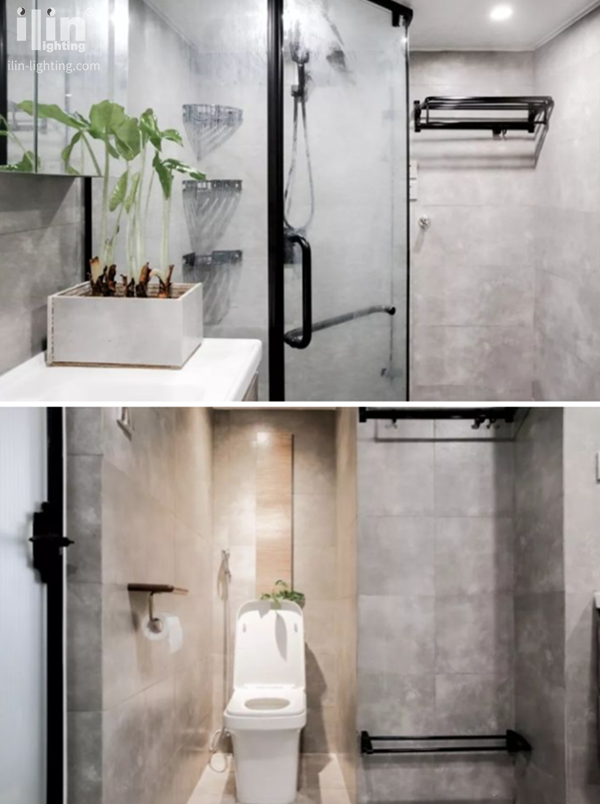 一層的衛(wèi)生間整體是灰色調(diào),啞光釉面的瓷磚很凸顯質(zhì)感。鏡柜上會顯示溫度和濕度,方便洗澡前預(yù)熱。衛(wèi)生間內(nèi)的凹墻處正好放置馬桶,巧妙地利用了空間,燈光設(shè)置得也恰到好處,讓人感覺很溫馨。