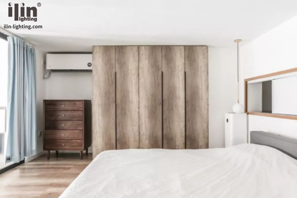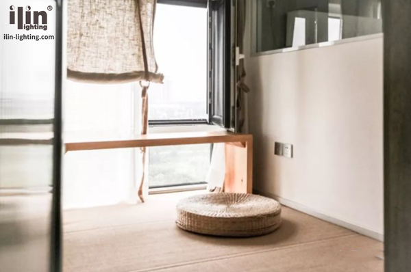 二層現(xiàn)在變成了由主臥,休閑室和衛(wèi)生間組成的綜合空間。休閑室有很多功能,設(shè)計師在落地窗旁放置了飄窗桌與蒲團,可以在這里邊看窗外的車水馬龍邊啜著清茶聽音樂,朋友來訪也能在這里待客聊天。