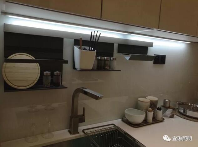 感應(yīng)式櫥柜燈是最方便使用的廚房局部照明燈具,感應(yīng)燈直接吸附在柜子底部,不需要人手按開關(guān),可以選擇手掃感應(yīng)或者人體感應(yīng)。比如宜琳照明手掃感應(yīng)無光點超薄柜底燈YL13026,最常應(yīng)用于操作臺上方的吊柜底部,還有洗碗池上方,在手上不方便按開關(guān)時直接揮手控制開關(guān)即可。