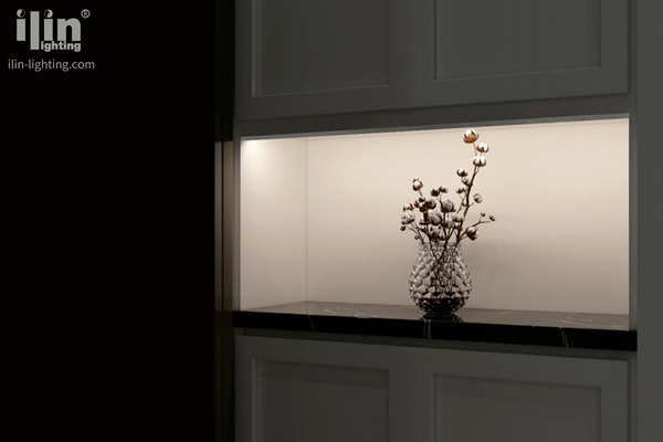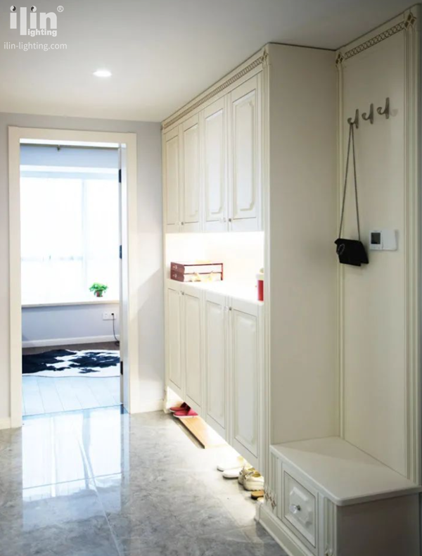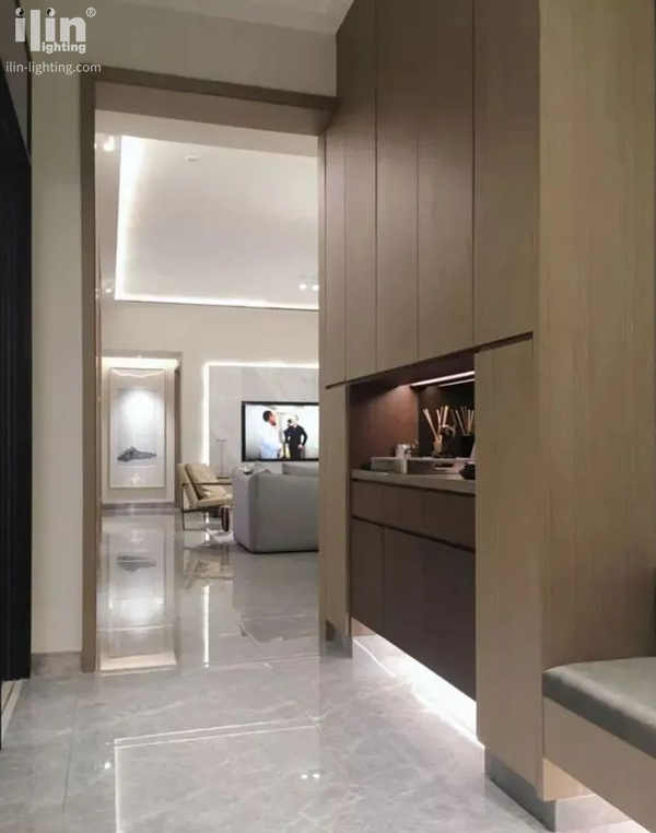 用一個(gè)通頂柜做玄關(guān)收納,它也不是全封閉式,中間留下一塊凹槽區(qū)域,可以放一些香薰等喜歡的小物件,再用宜琳櫥柜燈去進(jìn)行燈光展示,層次感立顯。