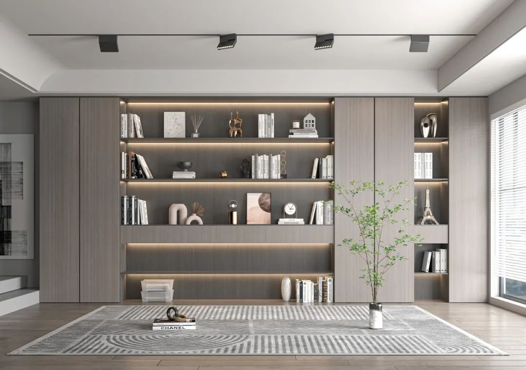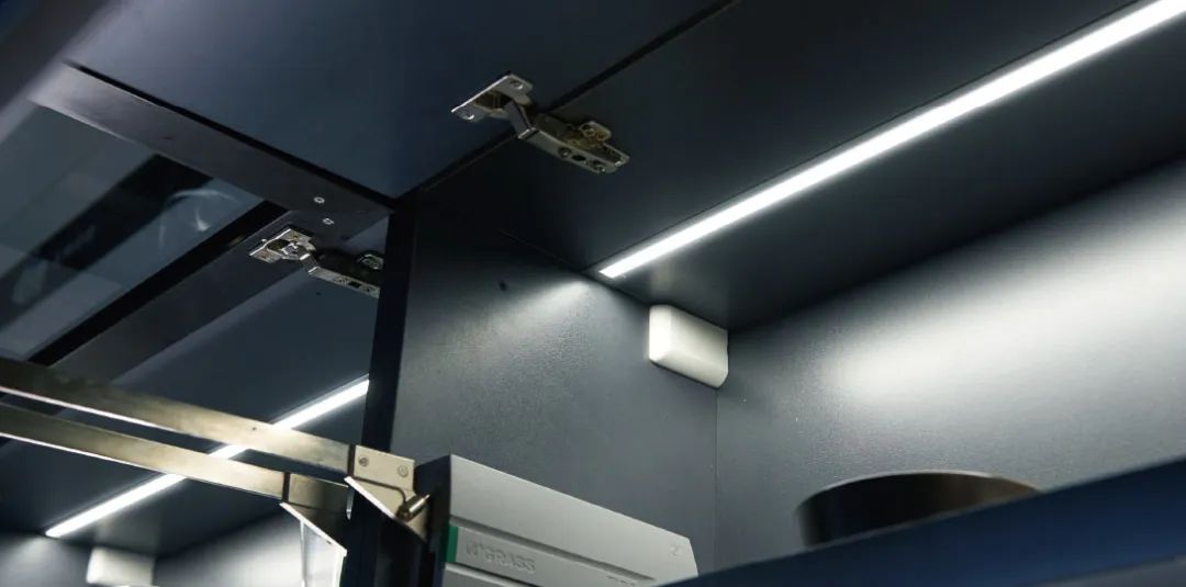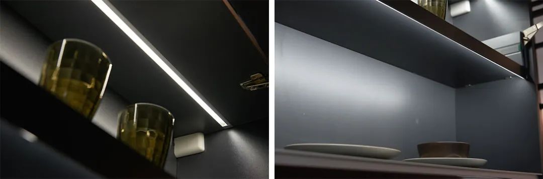 對于家具柜體內(nèi)的燈帶設(shè)計,一部分起到基礎(chǔ)照明的作用,另一部分則呼應(yīng)了簡潔的線性設(shè)計和對空間物體氛圍的渲染。