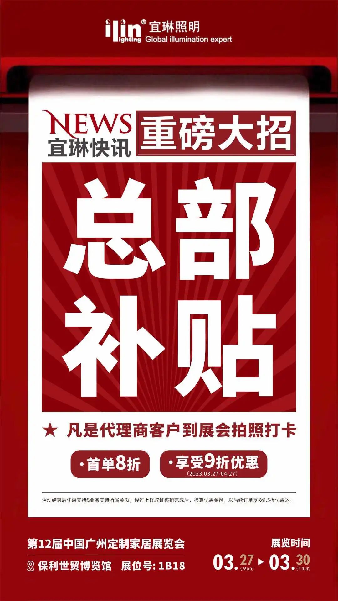 最后,鄭總發(fā)布總部重磅補(bǔ)貼,2023年3月27-30日期間,凡是代理商客戶到廣州定制家居宜琳照明展位打卡,即可享受首單八折、首月享受九折優(yōu)惠。